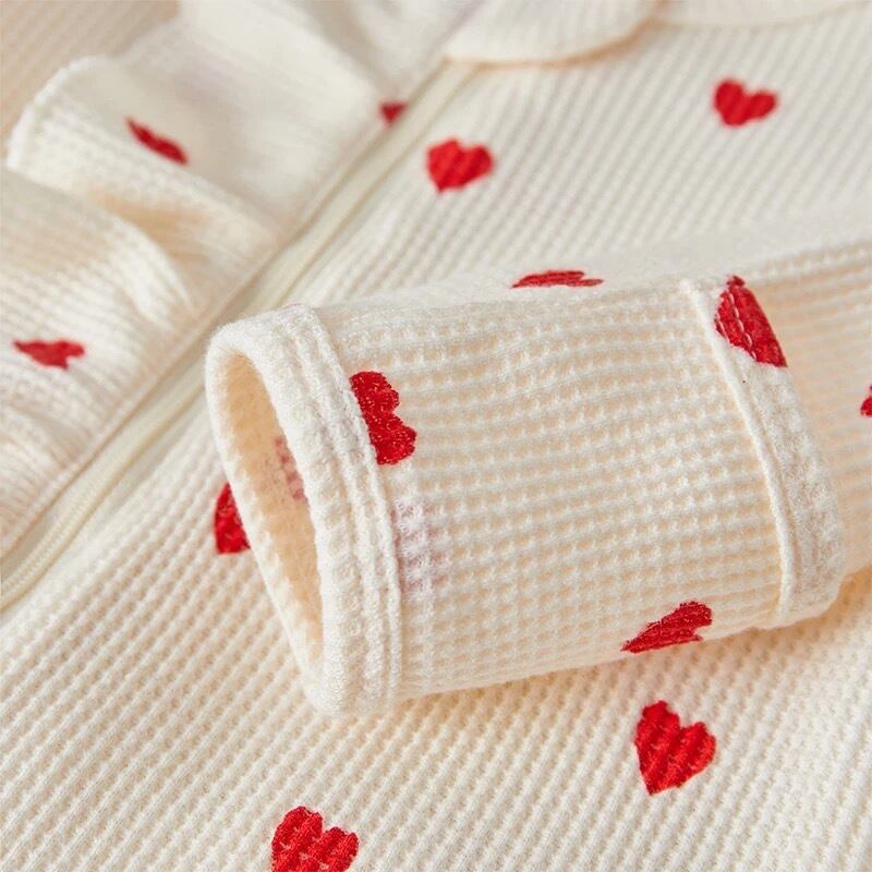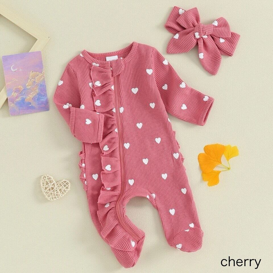 かわいいミニハートが全身にプリントされた長袖ロンパース♡